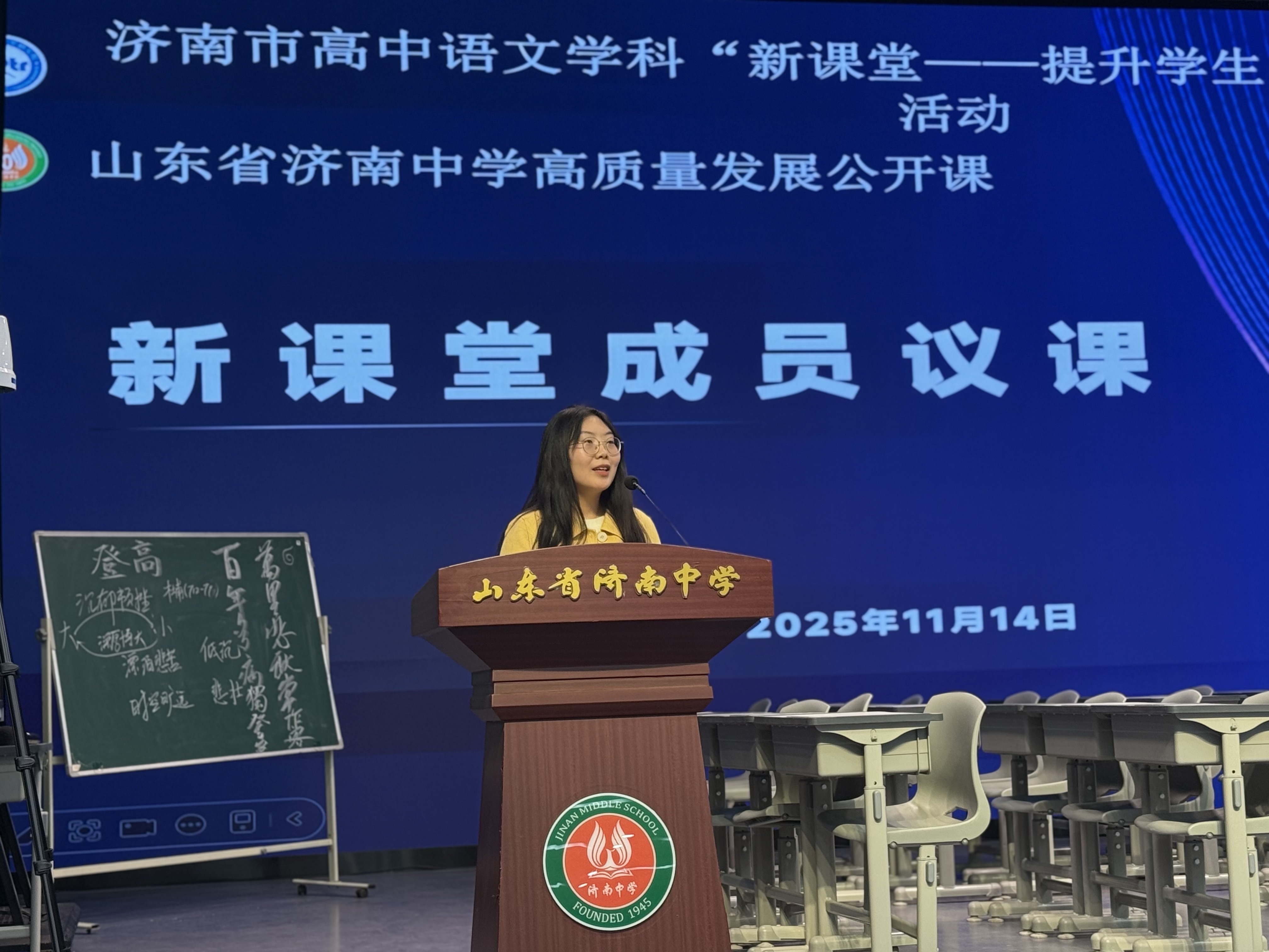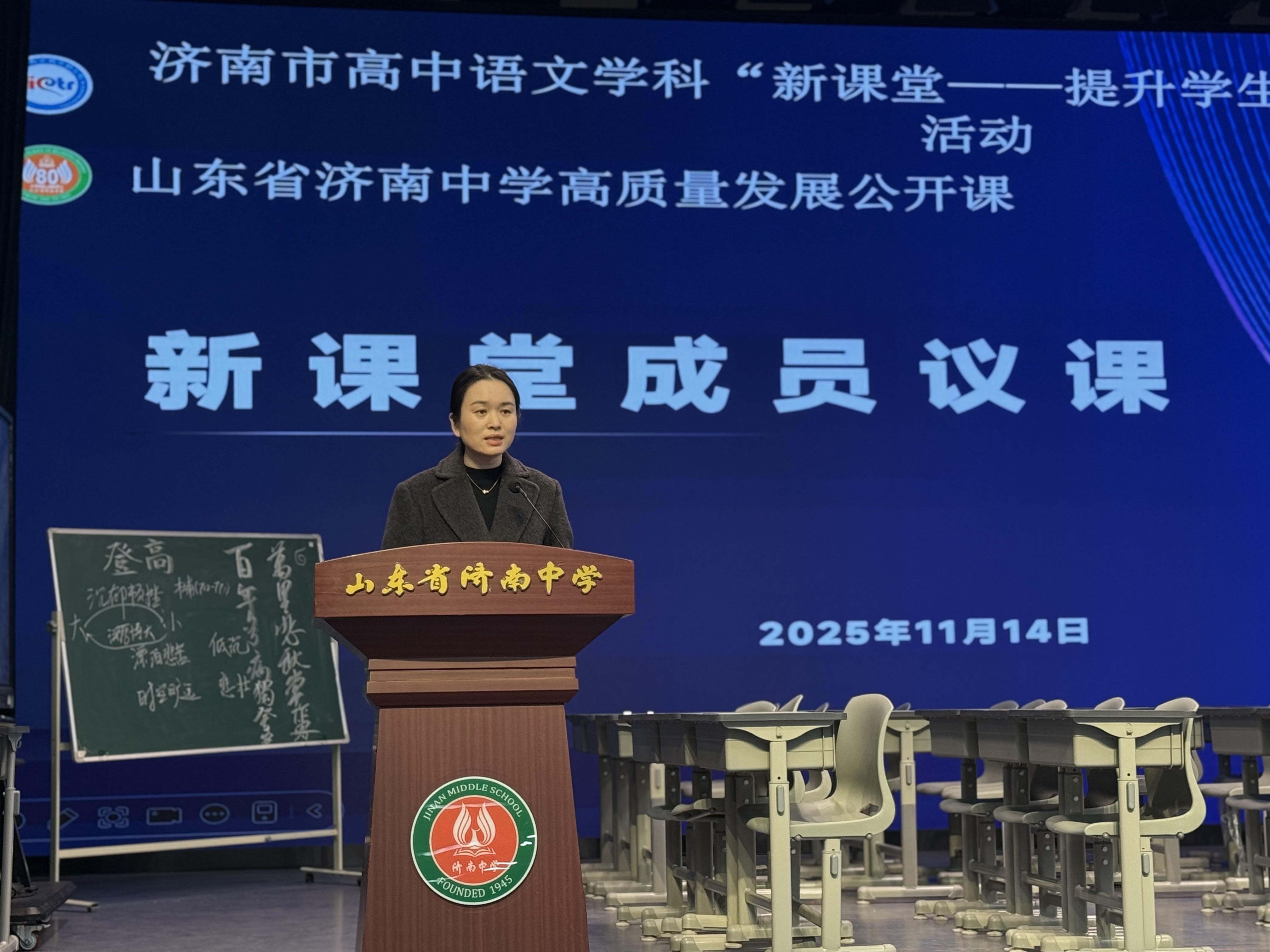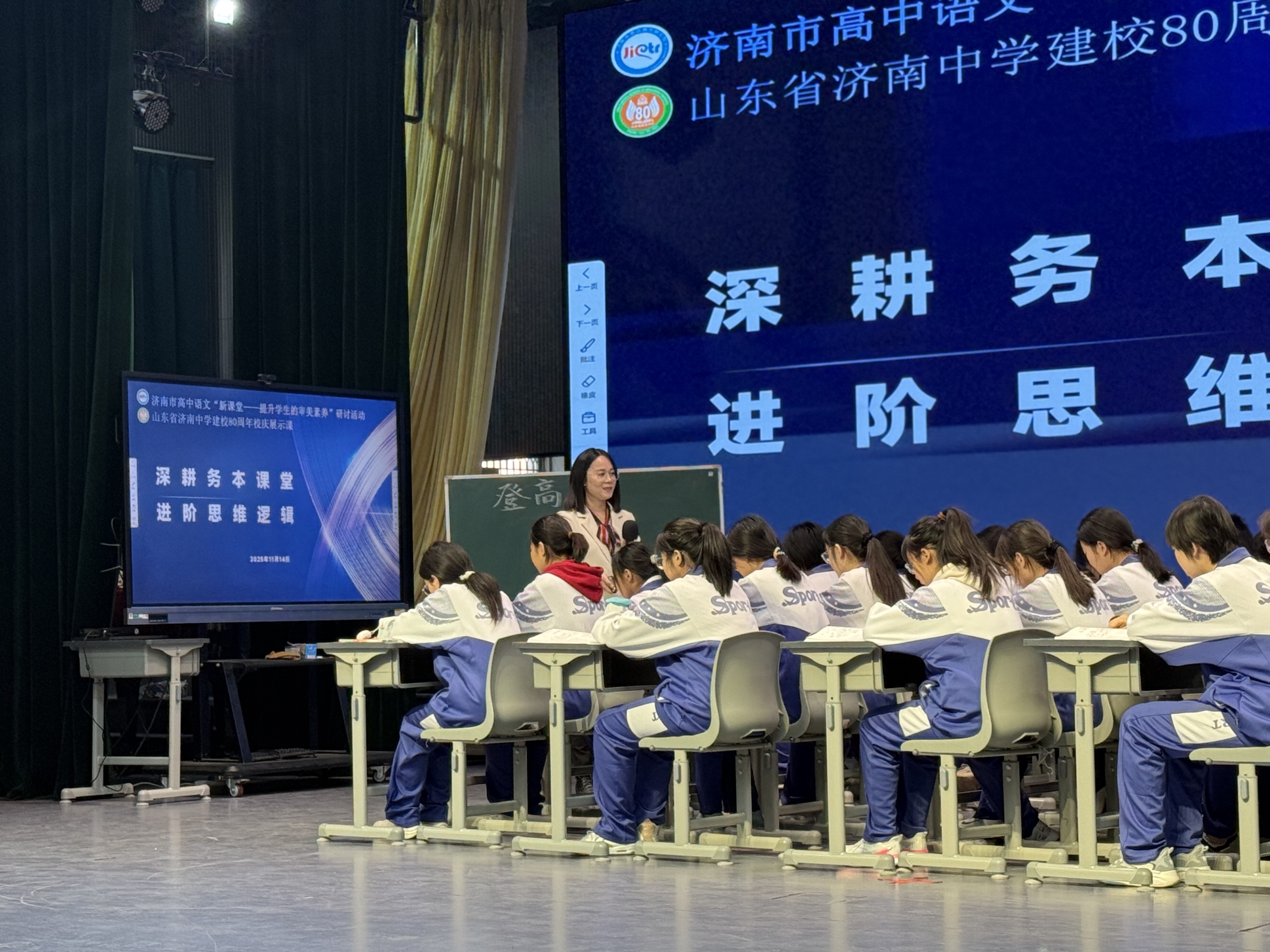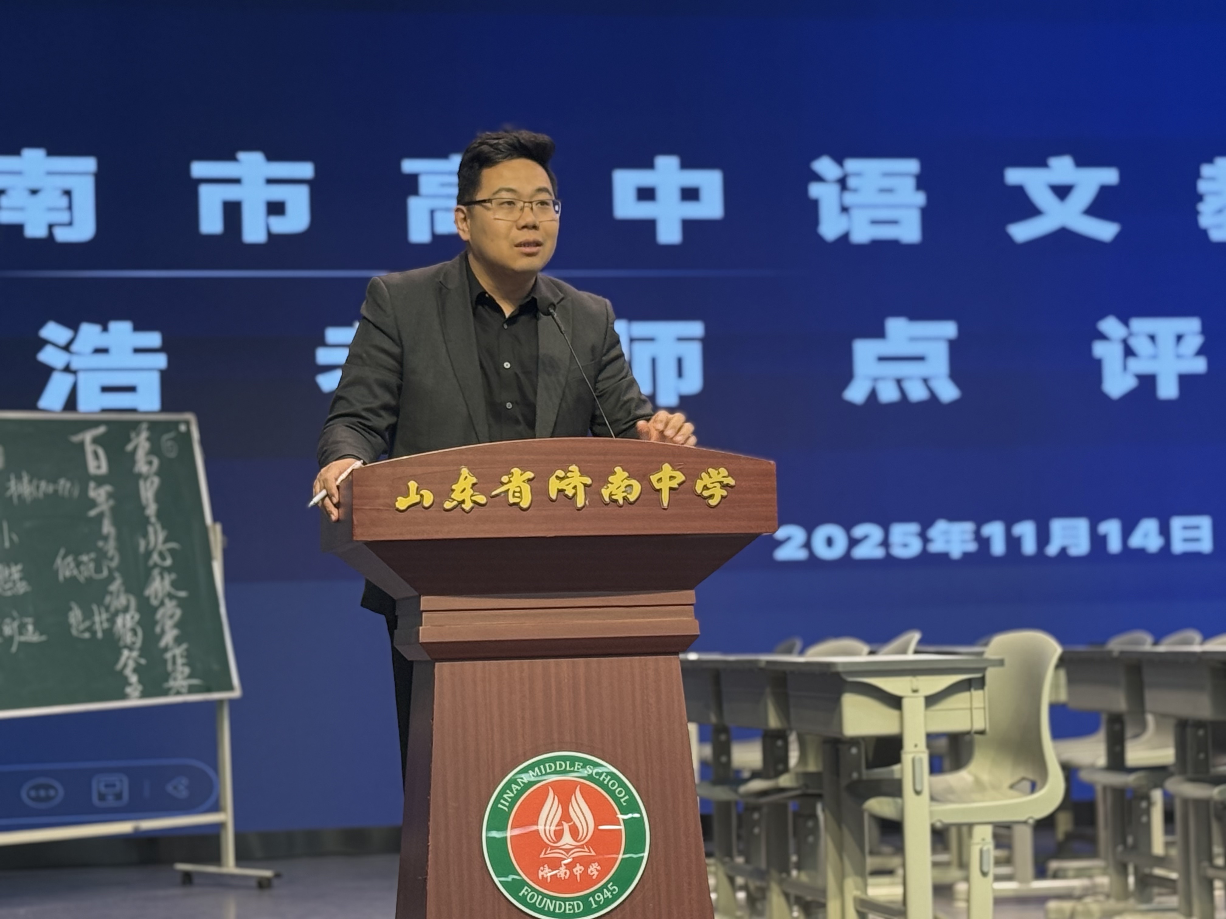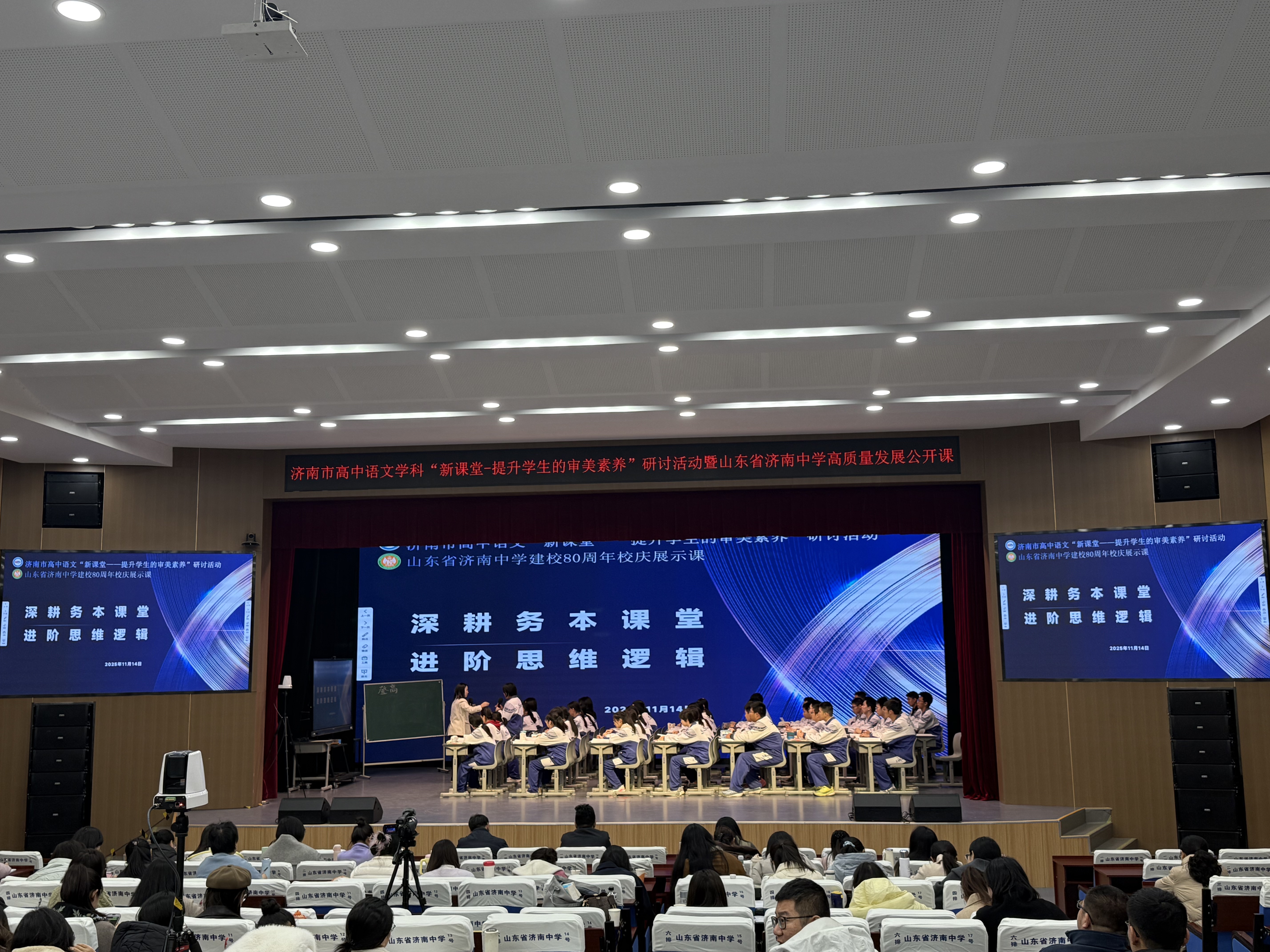 11月14日,济南市高中语文“新课堂——提升学生的审美素养”研讨活动暨山东省济南中学“深耕务本课堂 进阶思维逻辑”高质量发展公开课在铁一校区举行。济南市教育教学研究院高中语文教研员葛浩、济南中学副校长安学保,教学管理部主任马宁宁,济南市语文教师共同观摩,活动由济南中学铁一校区高中语文教研组长姜华主持。