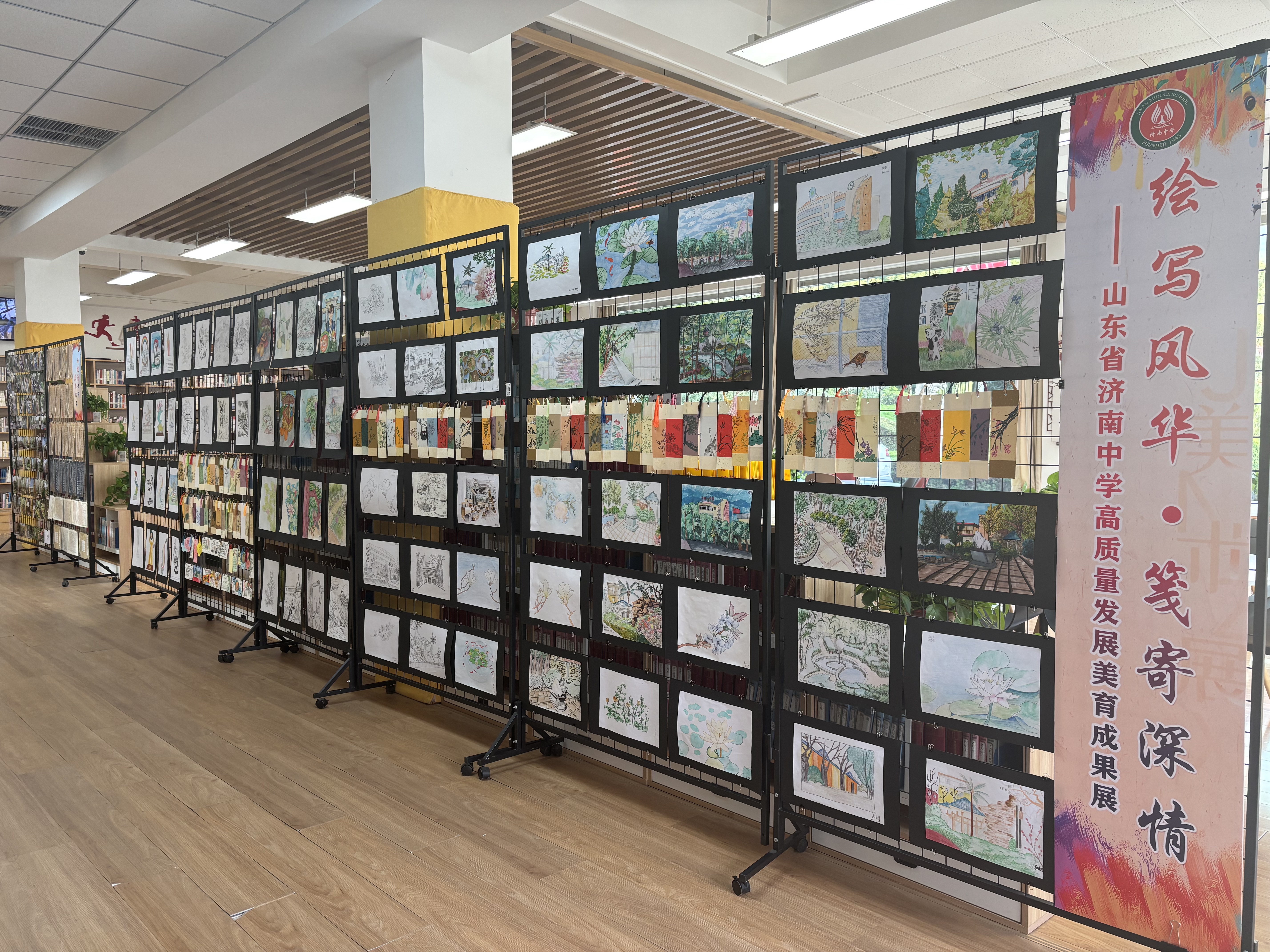 午后,教师们移步笃学书吧,参观济南中学高质量发展美育成果展。师生创作的校园写生、创意书签、摄影及书法作品琳琅满目,生动体现了“以美育人”的实践成效。