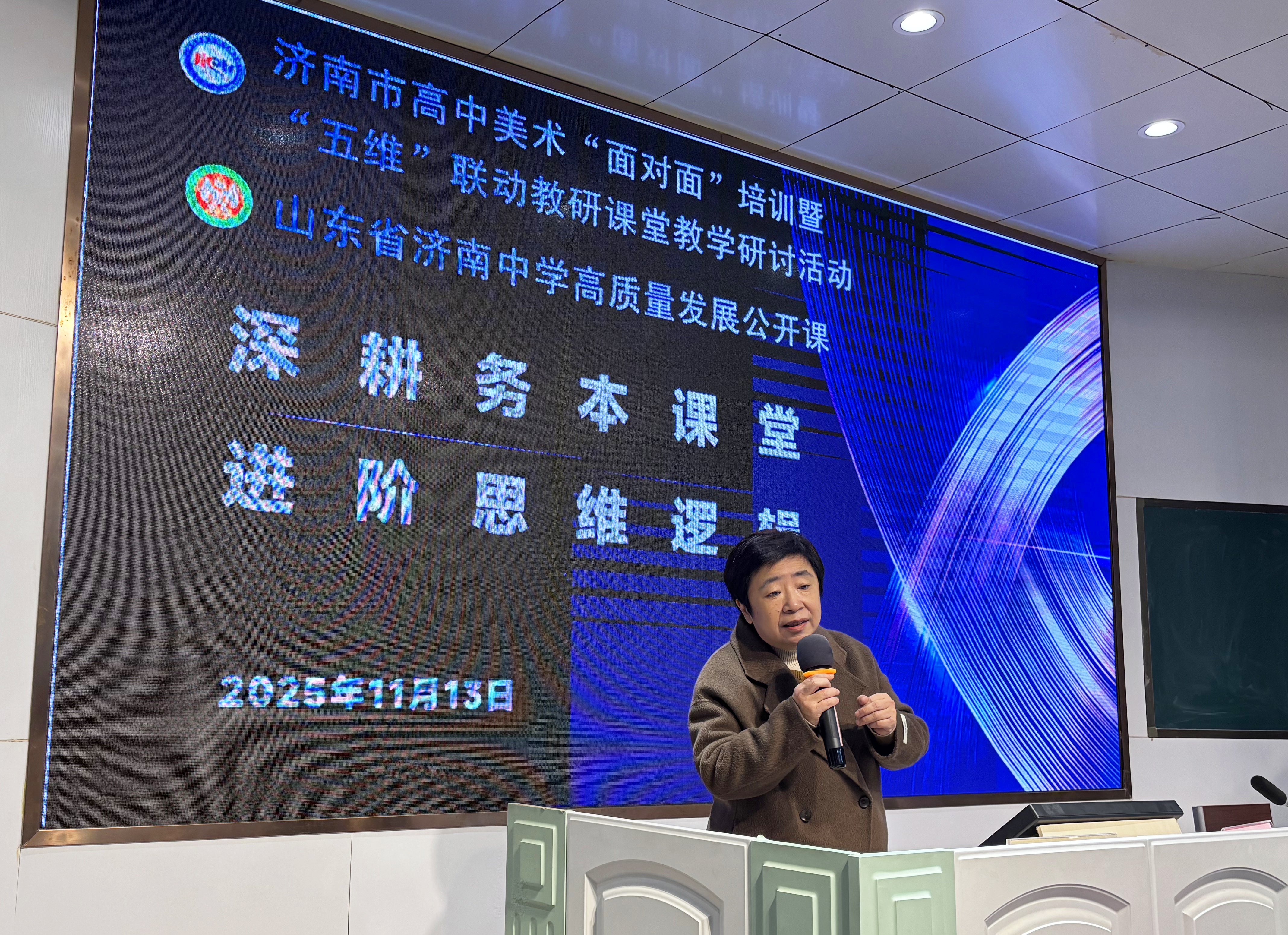 11月13日,济南市高中美术“面对面”培训暨“五维”联动教研课堂教学研讨活动在济南中学铁一校区圆满举行。本次活动由济南市教育教学研究院主办、济南中学承办,作为济南中学“深耕务本课堂,进阶思维逻辑”高质量发展公开课系列活动的重要一环,吸引了全市高中美术教师参与,共同探索美育创新路径。活动由济南市教研院张焕玉主持,山东省教研员肖钢、济南中学党委书记钟红军出席活动,现场学术氛围浓厚。