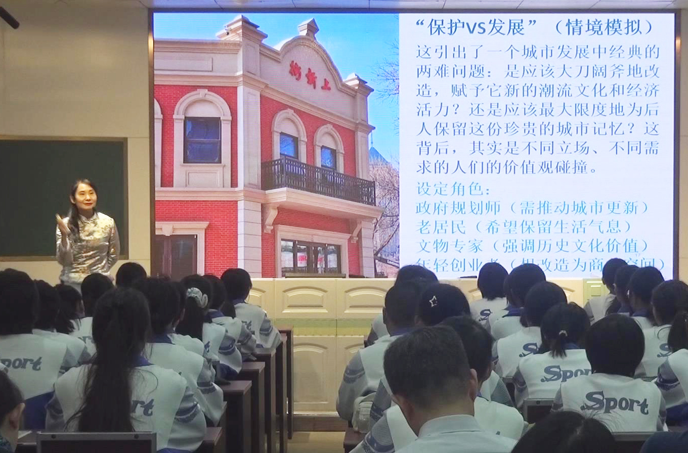 下午的高质量发展公开课将活动推向高潮。石健蕾老师执教《人居与环境——诗意的栖居》一课,以济南“上新街”改造为案例,引导学生从城市规划师、居民、创业者等多视角思考城市更新与人文保护的平衡,共同探讨如何重建人与自然深层次的情感联结。