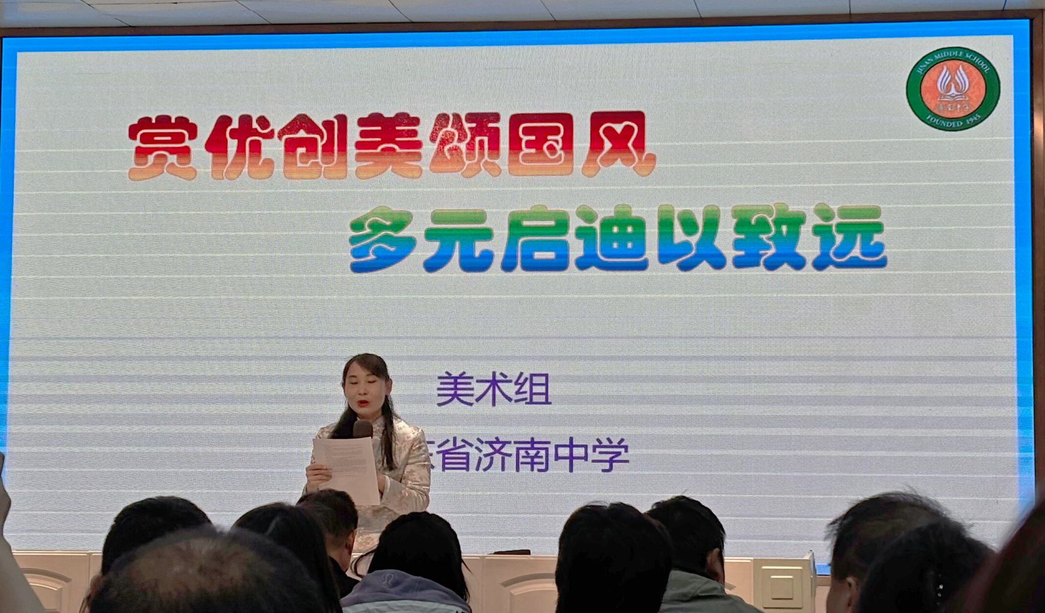 济南中学石健蕾以《赏优创美颂国风 多元启迪以致远》为题,系统介绍了学校美术学科建设的递进式课程体系与探索路径,展现了学校基于新课改要求的美育实践成果。