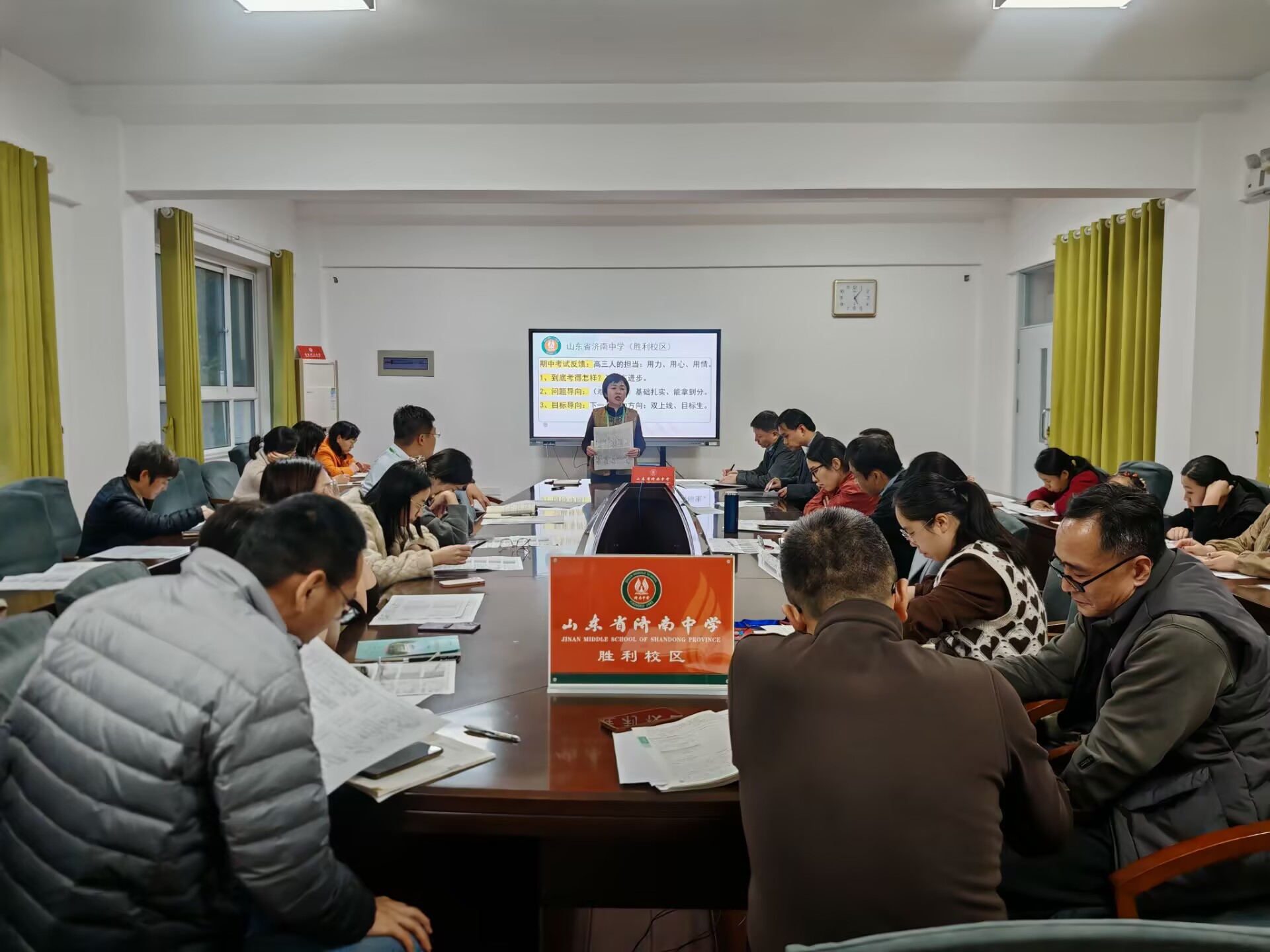 二、精准分析明方向,务本求实提质量11月11日,高三年级期中教育教学会,张玉峰主任用翔实的数据、清晰的图表勾勒学情全貌,为教师精准把握教学重点、靶向解决学生问题提供了坚实依据。王部长在讲话中动情强调,学子成绩的稳步提升,离不开每一位教师的责任担当与匠心耕耘。她号召全体教师坚守“务本求实”初心,坚持目标导向与问题导向并行,深耕课堂主阵地、抓实作业辅导关键环节,在夯实学科基础中筑牢备考根基,聚焦“双上线”目标精准发力,用精益求精的育人实效,为学校八十华诞夯实高质量发展的办学底蕴。