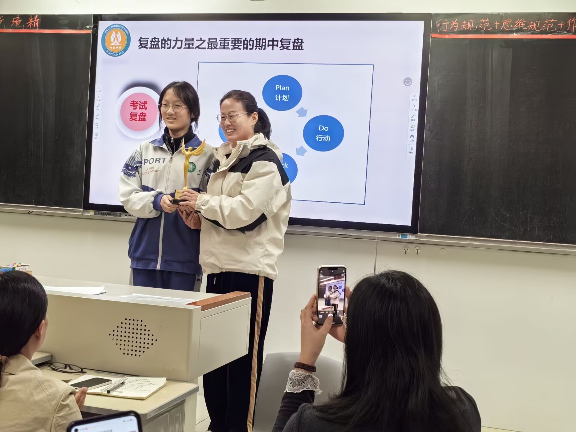 三、榜样如灯燃初心,八秩荣光催奋进11月12日,“八秩荣光励青春,200天蓄力再出发”期中学情检测表彰大会隆重举行。大会设立了“笃学领航之星”“笃学优胜之星”等,表彰学子们的笃学不怠的勤勉;“敦品责任之星”“敦品奉献之星”则彰显了学生们崇德向善的品格担当;“笃学榜样班级”荣誉肯定了集体的团结奋进;特别设立的“教师务本奖”,是对默默耕耘、潜心教学的教师们致以崇高敬意。优秀学生代表邢庆锐分享学习心得,勉励同学们珍惜最后两百天时光,以青春豪情响应时代召唤;教师代表李爱芳以《行至半山,聚力登峰》为题,用温暖而坚定的话语勉励学子不畏险阻、勇攀高峰;王骁波部长则以“做一个坚定的行动主义者”的铿锵号召,激励师生目标明确、步履不停。大会在全体师生齐唱校歌《向光而行》的激昂旋律中推向高潮,歌声中满载对未来的憧憬与奋进的决心,以拼搏姿态为校庆增添青春色彩。