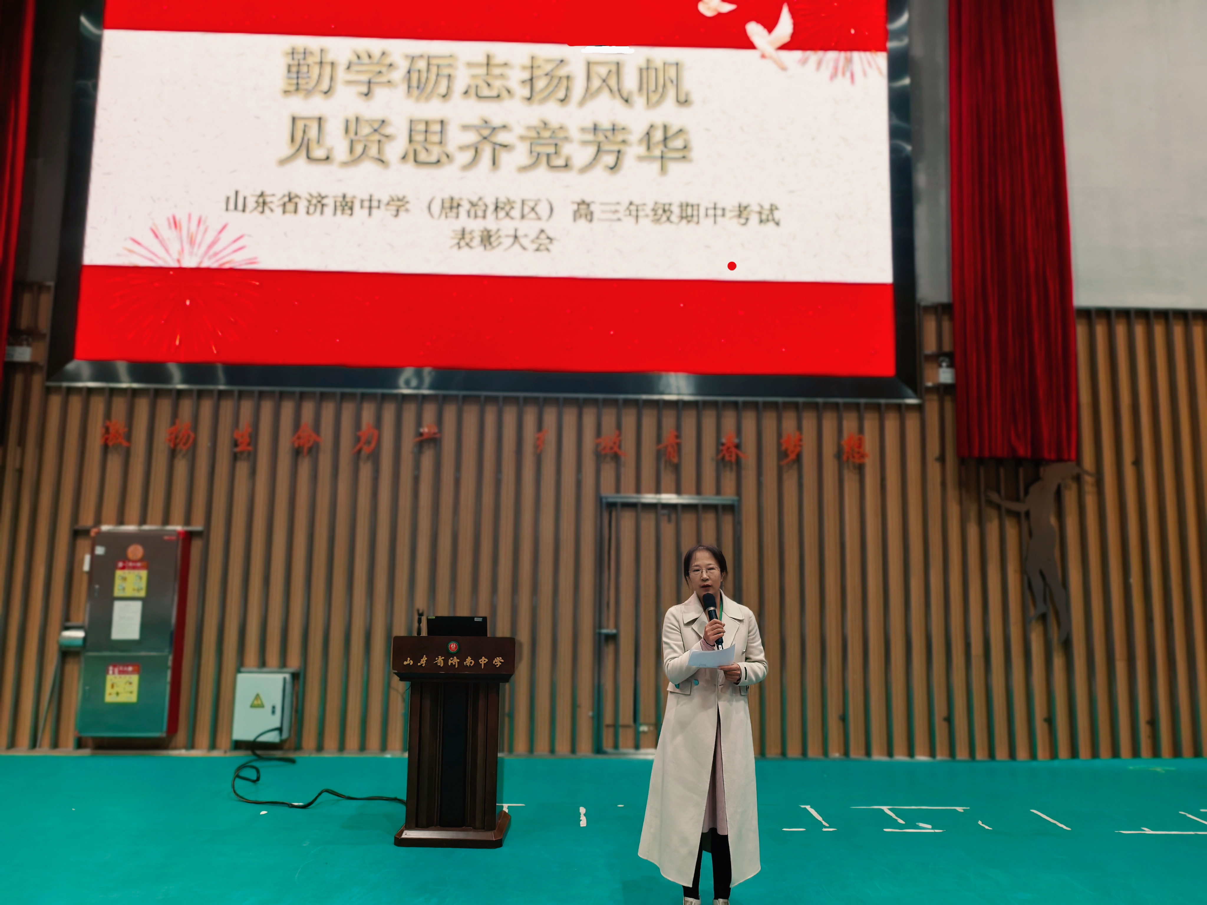 近日,济南中学唐冶校区高三年级期中表彰大会在学校体育馆隆重举行,大会为全体高三学子注入了澎湃的动力与坚定的信念。教育教学管理部主任郭淑杰,高三年级管理团队主任王庆、王佳,年级主任张延磊、宋艳,高三年级全体班主任以及高三学生参会。会议由王佳主持。