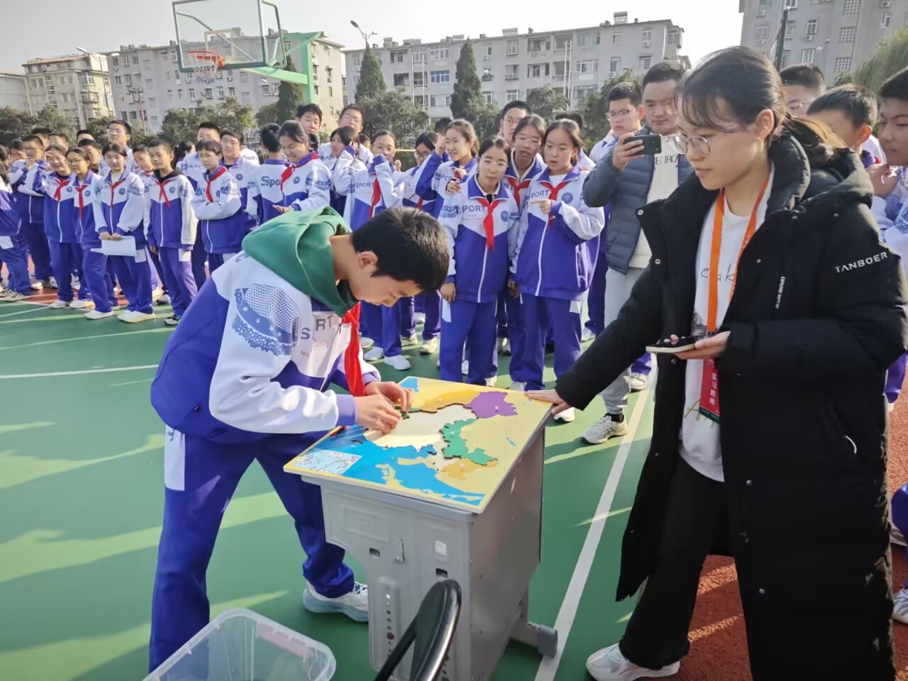 【团体接力:众志成城,共绘山河卷】 紧随个人赛之后的是更加考验团队协作的团体接力赛。以班级为单位的各支代表队,需要以接力的形式,共同完成一幅完整的中国行政区拼图。这不仅是对个人地理知识的检验,更是对团队策略、协作与默契的严峻考验。赛场上,队员们分工明确,交接有序,彼此鼓励;赛场下,啦啦队的加油声、欢呼声此起彼伏,汇聚成一片欢乐的海洋。