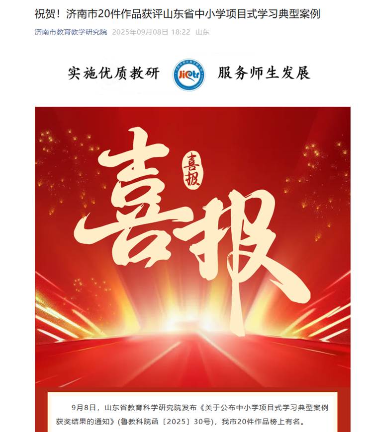 此次案例征集活动严格依照《山东省教育科学研究院关于开展中小学项目式学习典型案例征集活动的通知》(鲁教科院函〔2024〕100 号)要求开展,经各市教科院(教研院)推荐、省教科研院资格审查与专家评审,最终全省共评选出一等奖案例 51 项、二等奖 102 项、三等奖 152 项。我校为济南市高中学段唯一的一等奖获得者,9月8日济南市教育教学研究院发出喜报祝贺!