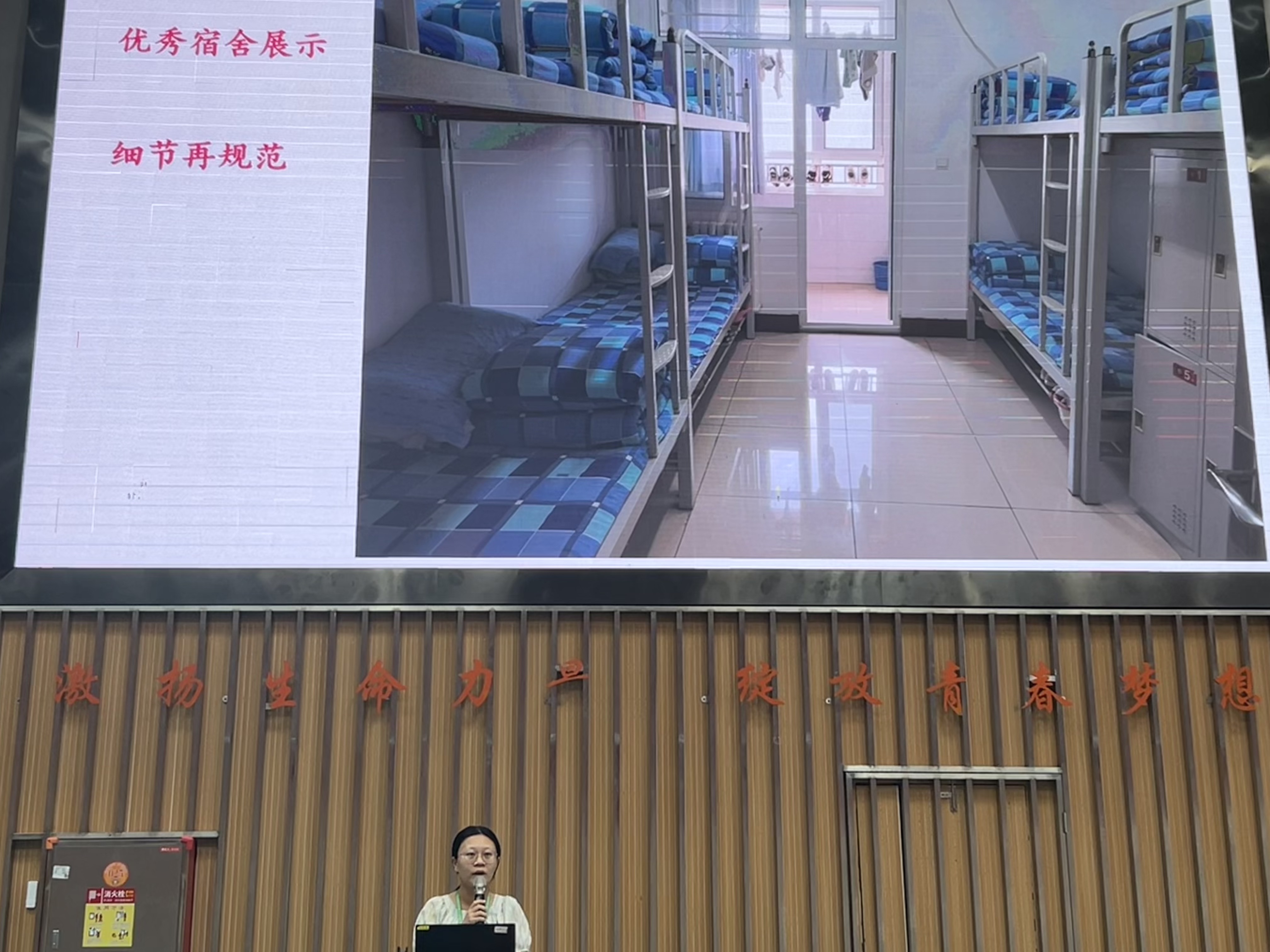 随后,宿舍管理部副主任常方圆为新生们详细解读了宿舍纪律要求、卫生标准以及日常量化评分细则。常方圆的讲解生动具体,她不仅传授了实用的内务整理技巧,还强调了宿舍作为“第二个家”的重要性,鼓励新生们共同营造一个温馨、有序的生活环境。她的分享让新生们对宿舍生活有了更清晰的认识和期待。