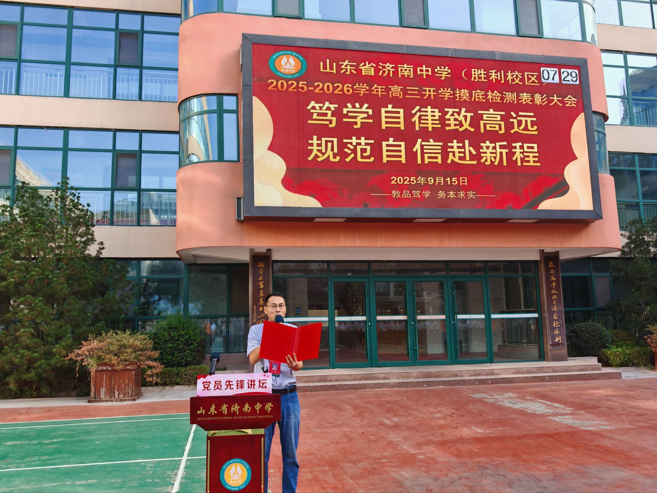 近日,山东省济南中学胜利校区成功举行“笃学自律致高远 规范自信赴新程”高三年级开学摸底检测表彰大会。大会旨在表彰先进、树立榜样,为新一届高三学子的备考之路点燃斗志、指明方向。全体高三师生共同参与,现场气氛热烈。本次会议由高三年级主任岳新武主持。