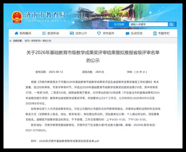 本次评选根据《济南市教育局关于开展2026年基础教育市级教学成果奖评选及省级教学成果奖推报工作的通知》有关部署,经过材料审核,专家评审等环节,评选出2026年基础教育市级教学成果奖拟授奖成果215项,其中特等奖37项,一等奖78项,二等奖100项。