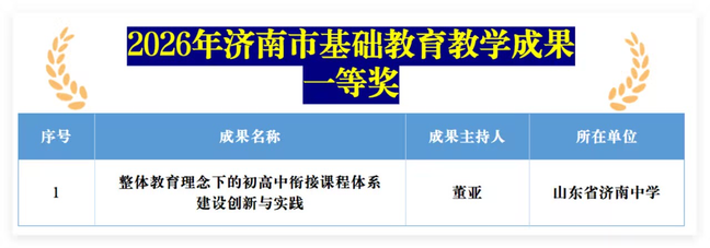 近日,济南市教育局发布了《关于2026年基础教育市级教学成果奖评审结果暨拟推报省级评审名单的公示》,我校申报的教学成果《整体教育理念下的初高中衔接课程体系建设创新与实践》荣获一等奖,并被推荐参加省级教学成果评审。