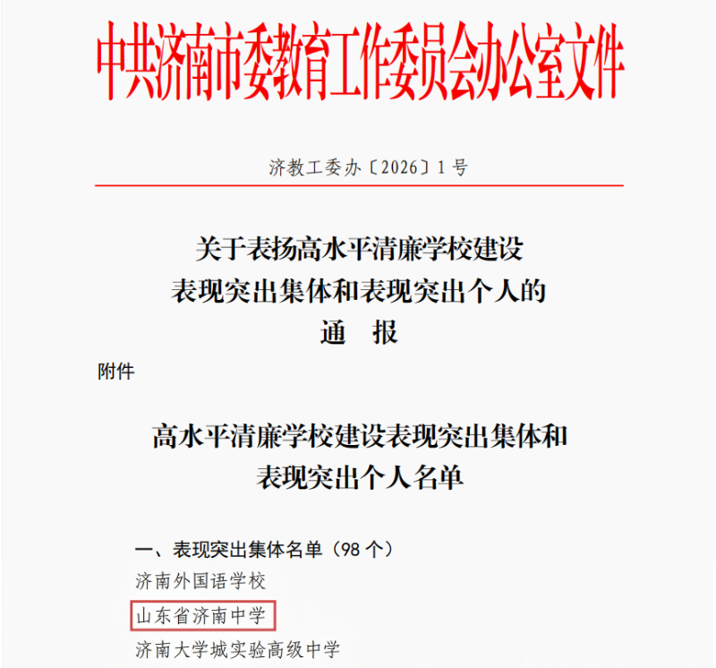 山东省济南中学获评 “济南市高水平清廉学校建设表现突出集体” 近日,中共济南市委教育工委公布了高水平清廉学校建设表现突出集体和个人评选结果,山东省济南中学获评“高水平清廉学校建设突出集体”,这是学校深入贯彻落实新时代党的建设总要求,推进全面从严治党、深化党风廉政建设的成效体现。 近年来,济南中学一直将加强新时代廉洁文化建设、崇廉尚德拒腐防变作为筑基之策、固本之举。2020年起先后创建了廉政文化品牌、“敦品尚廉”廉洁文化品牌及“尚廉扬正气·务实育新人”党建品牌,在实践探索与经验积淀中提炼出“五大结合”“七大行动”实施路径,即清廉学校建设与“敦品笃学·务本求实”校训文化底蕴相结合、与阵地环境浸润相结合、与学生思想品德建设相结合、与师德师风建设相结合、与整治群众身边不正之风相结合,以及“铸魂领航”“制度廉建”“清风护校”“先锋聚力”“廉润桃李”“廉苑提质”“清风食安”七大行动,靶向施策、精准发力,推动清廉学校建设在学校高质量发展中走深走实。 学校会珍惜此次荣誉并以此为动力,进一步厚植校园廉洁文化底蕴,将清廉理念融入办学治校全过程,为高水平清廉泉城建设、清廉山东建设贡献新的力量。(党群工作部)