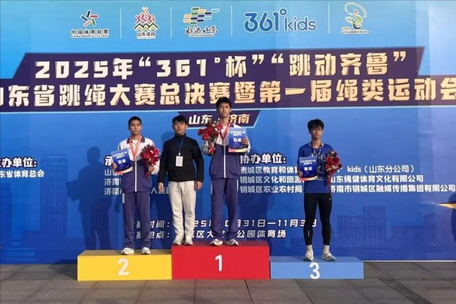 近日,2025年“361°杯”“跳动齐鲁”山东省跳绳大赛总决赛在济南市钢城区热力开赛,来自全省各地的跳绳高手齐聚赛场,展开激烈比拼。济南中学教师朱士康带领高梓恒、金欣诺、张凯涛、杨雅茹四位学子强势出征,一举斩获30秒单摇、30秒双摇等多项冠军,累计13个第一名、4个第二名收入囊中,还因良好赛场风貌获“体育道德风尚奖”,成为赛事“冠军收割机”。