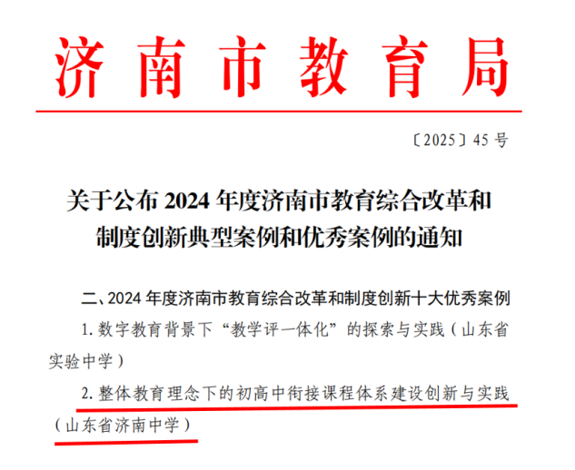质。构建初高中贯通培养的课程体系,并与山东大学、山东师范大学等高校教授合作进行双高联合育人,以课程体系建设为关键突破口,进一步优化初高中衔接课程体系,推动课程开发的持续创新,学校申报的“整体教育理念下的初高中衔接课程体系建设创新与实践”项目,凭借其卓越成效,成功入选2024年度济南市教育综合改革全链条A等级培育项目,并入选2024 年度济南市教育综合改革和制度创新十大优秀案例。
