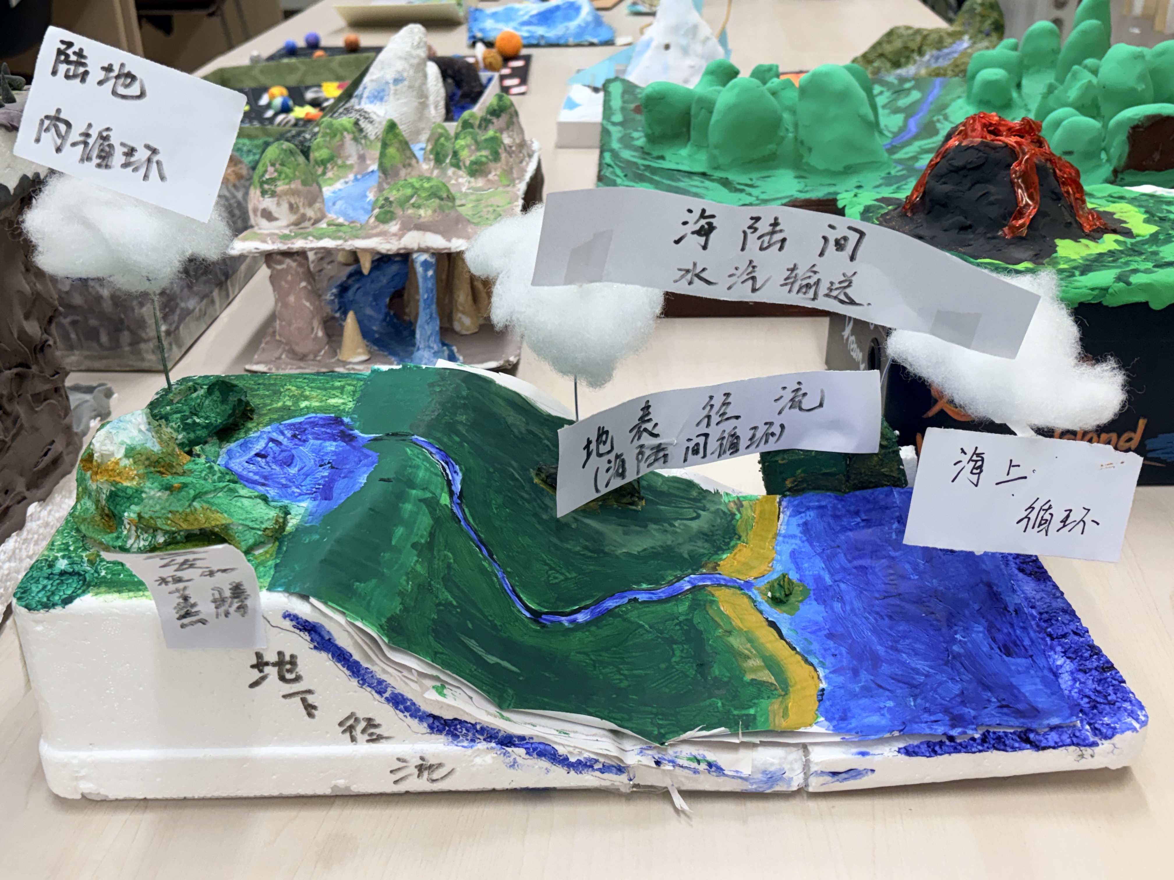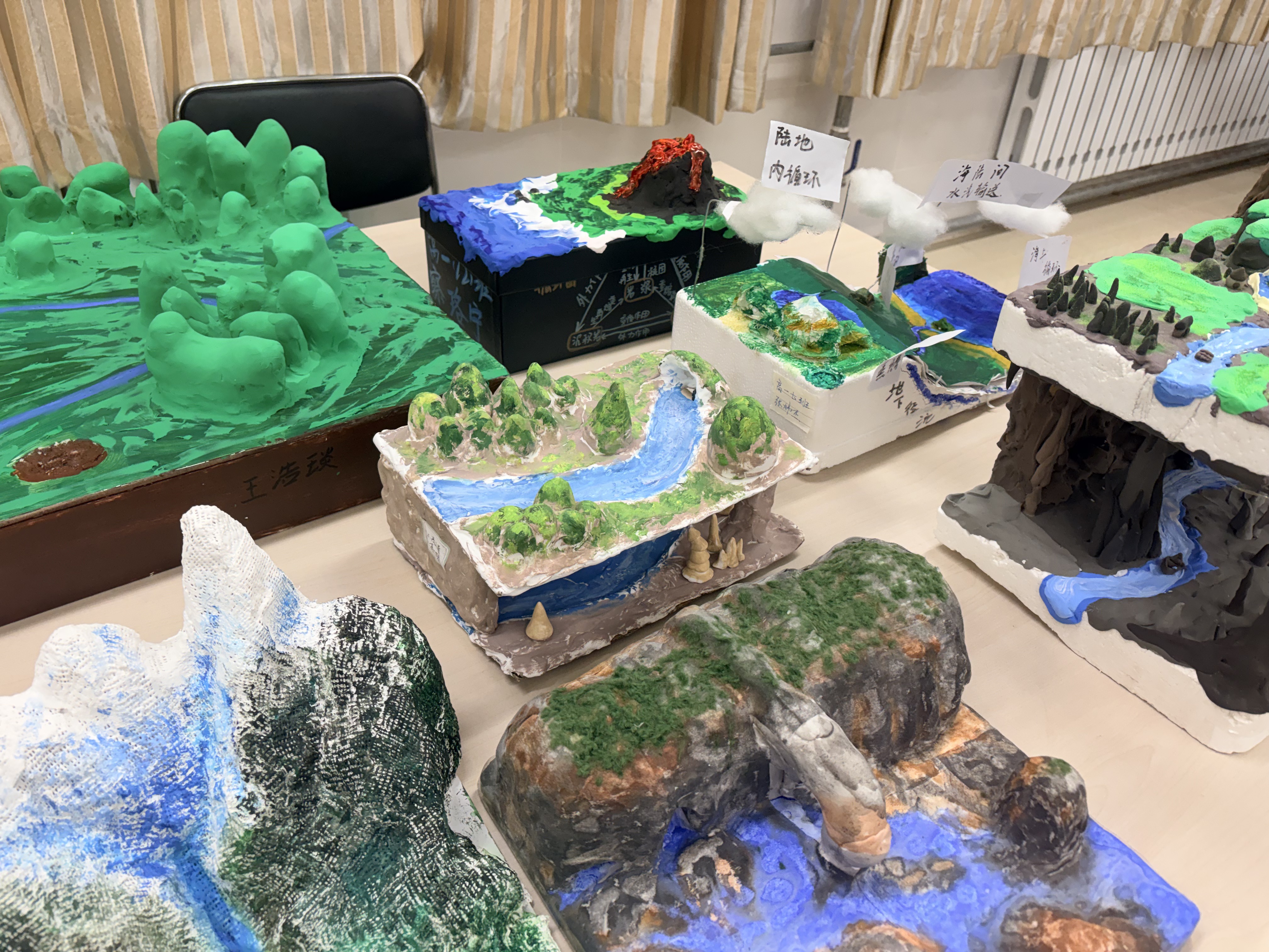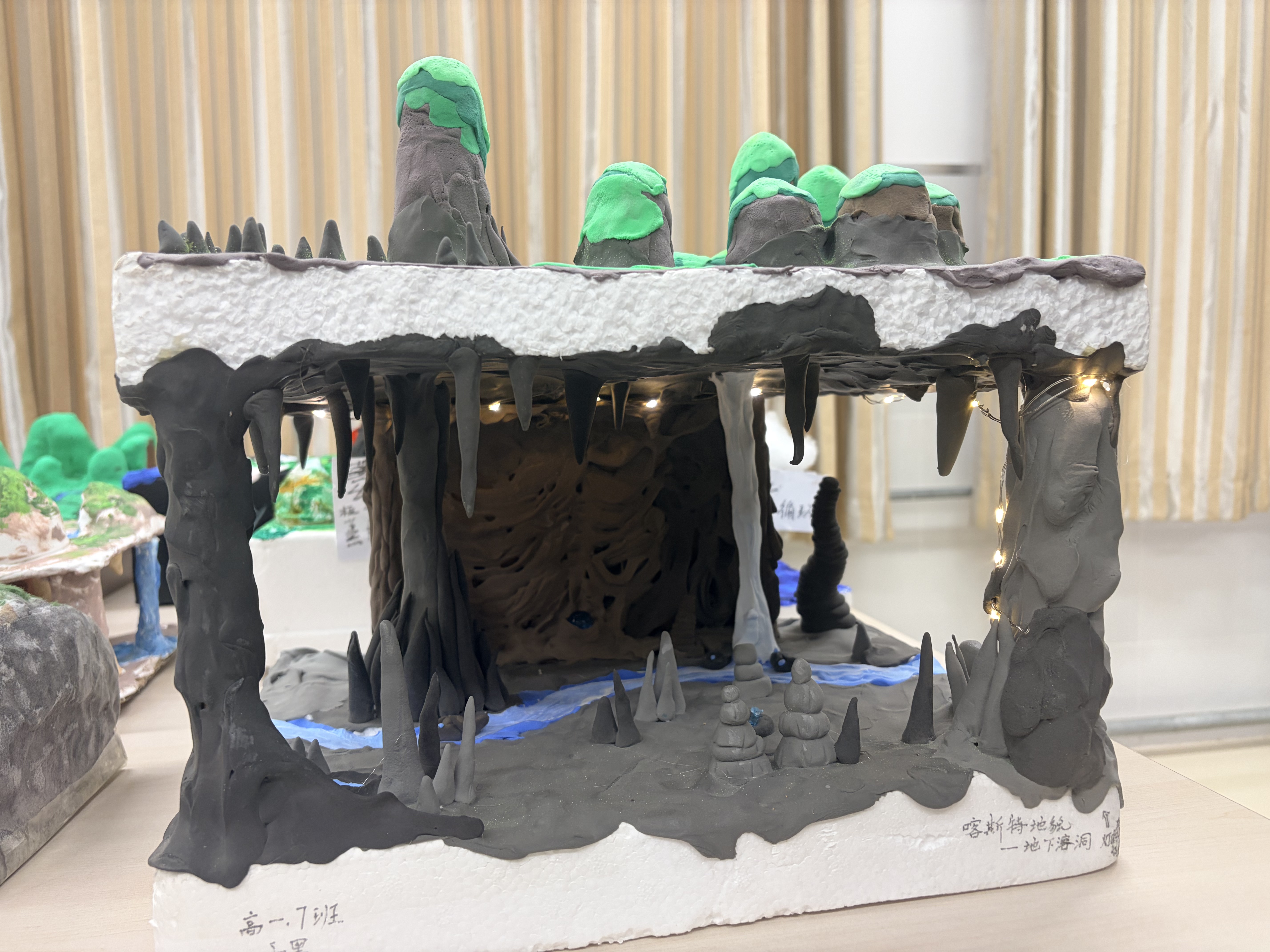 创意绽放:模型里的地理世界 消息一经发布,高一年级学生热情高涨,有的独自查阅教材、资料打磨细节,有的组队分工负责选材、制作,超轻黏土、硬纸板、颜料、塑料瓶、吸管等日常材料,在大家手中逐渐变成承载地理知识的“创意道具”。提交作品环节,教学楼展厅教室内摆满了同学们的精心之作,一件件充满巧思的模型让人眼前一亮。