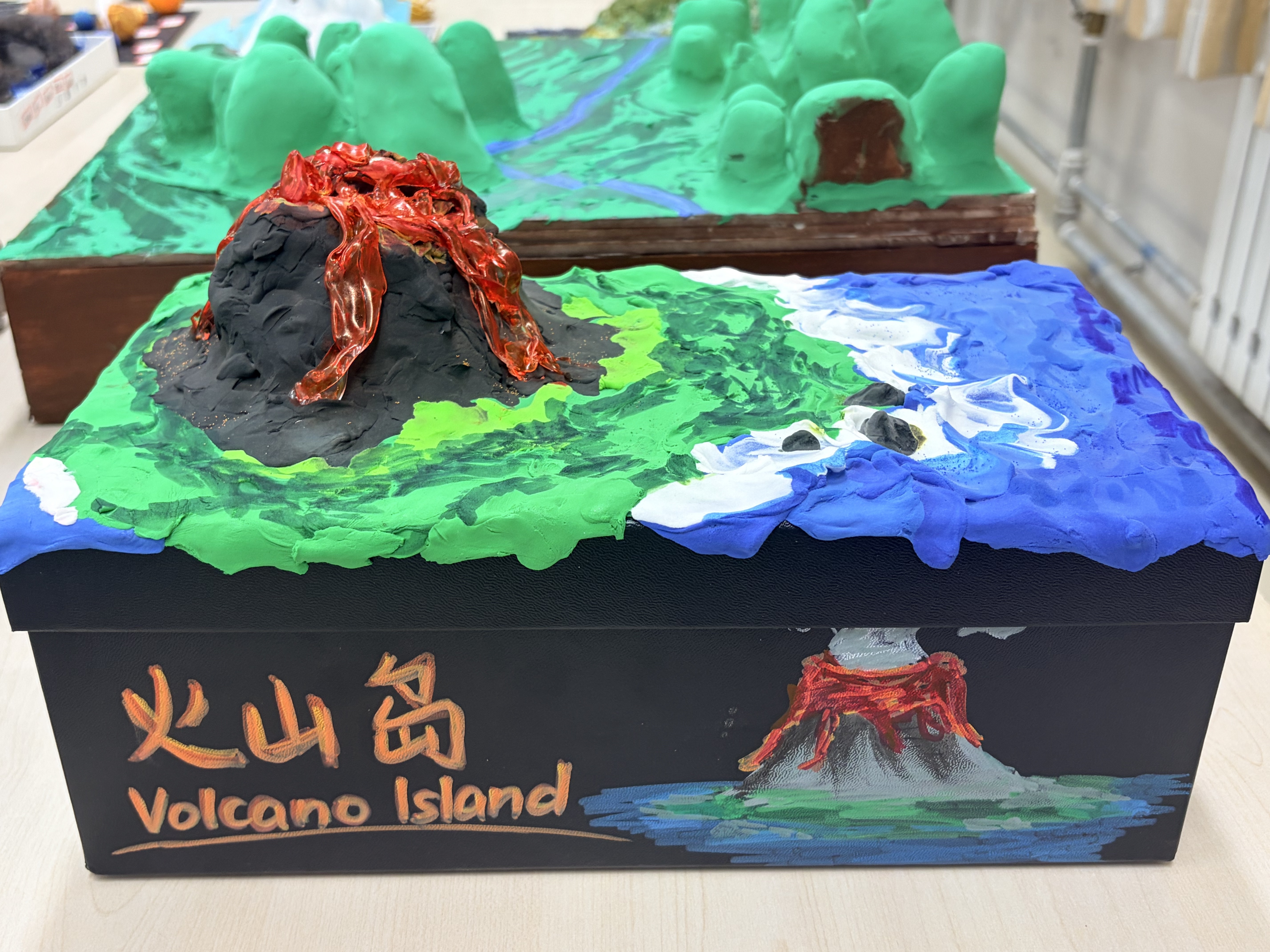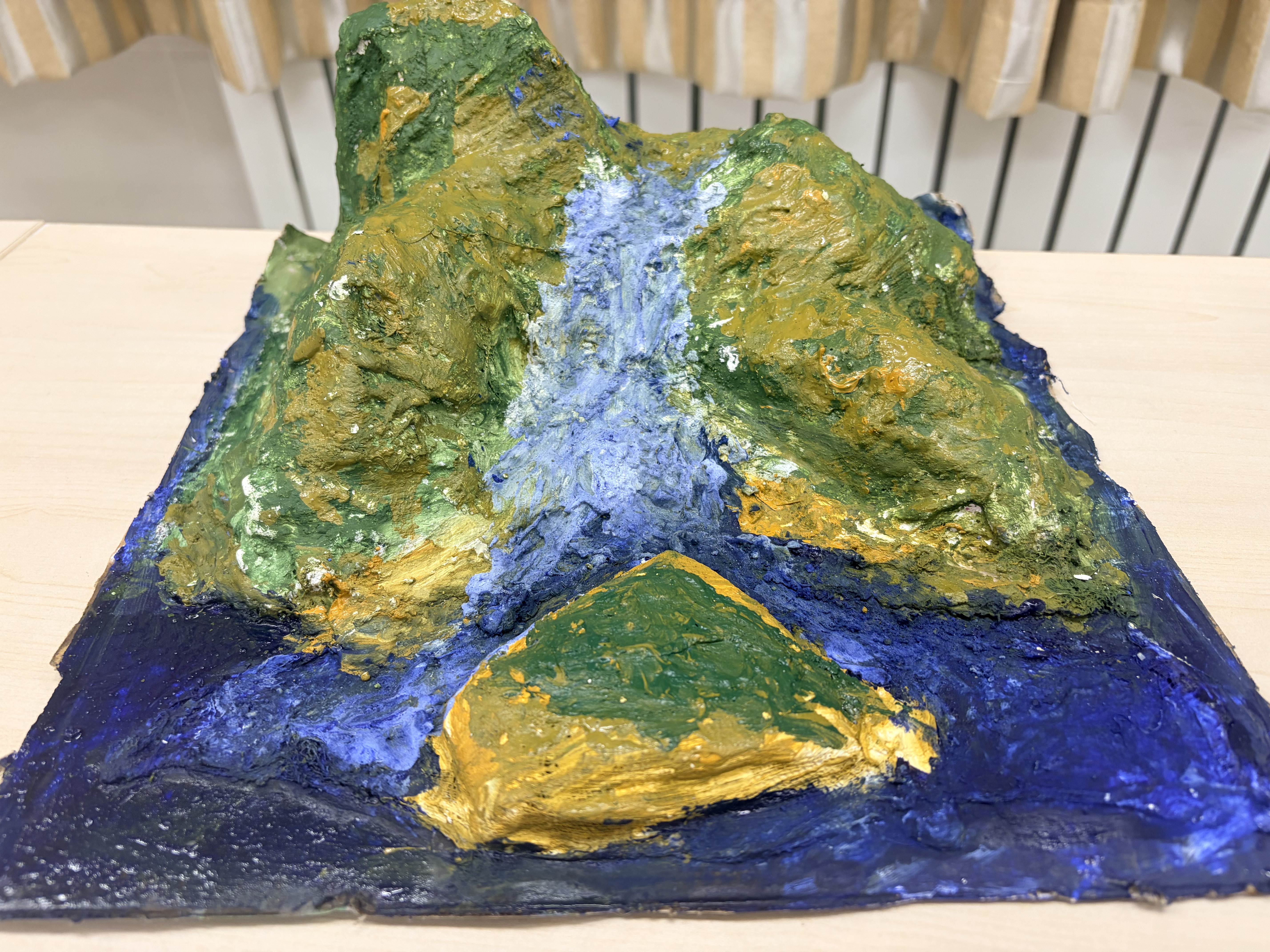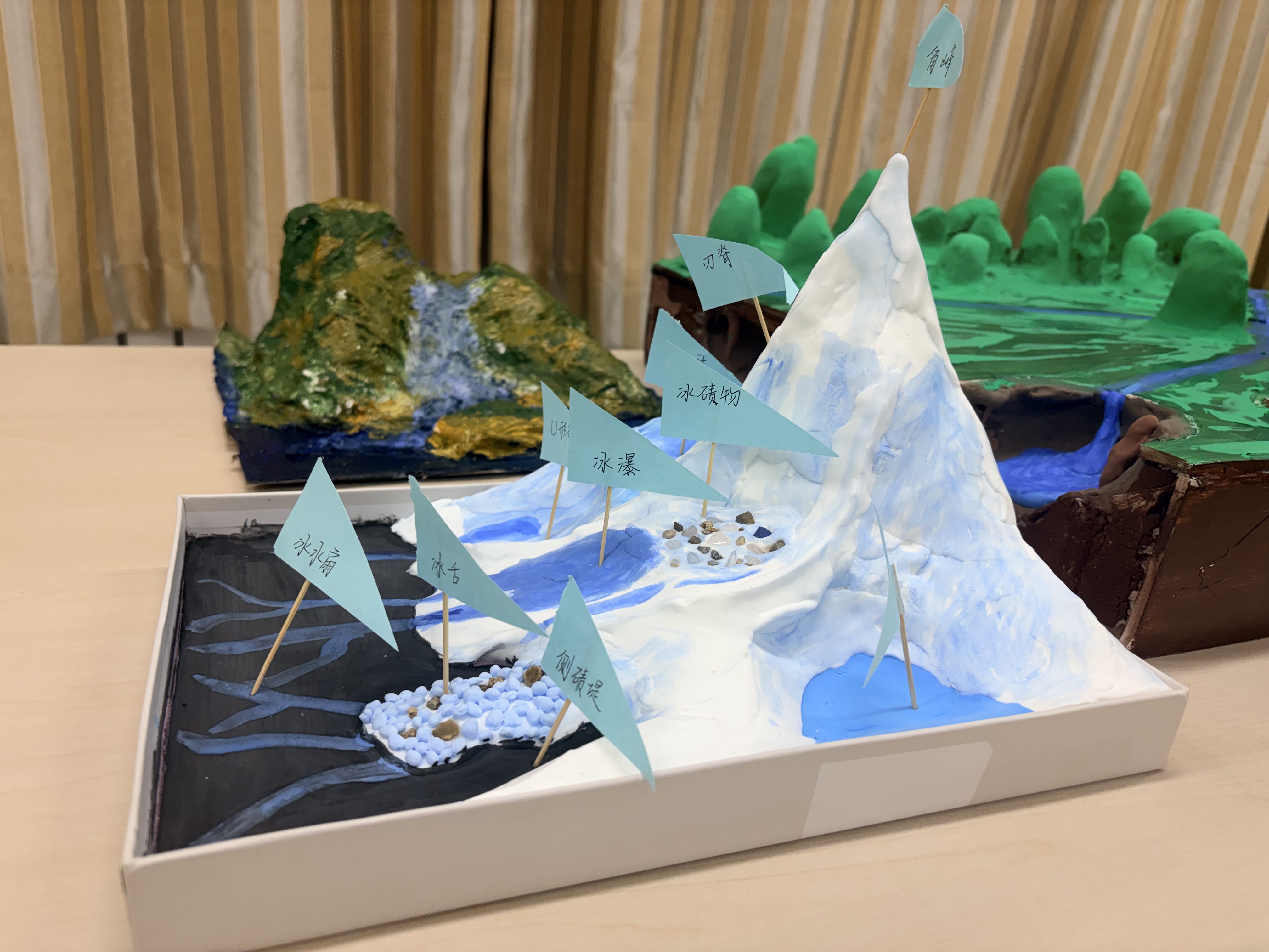 创意绽放:模型里的地理世界 消息一经发布,高一年级学生热情高涨,有的独自查阅教材、资料打磨细节,有的组队分工负责选材、制作,超轻黏土、硬纸板、颜料、塑料瓶、吸管等日常材料,在大家手中逐渐变成承载地理知识的“创意道具”。提交作品环节,教学楼展厅教室内摆满了同学们的精心之作,一件件充满巧思的模型让人眼前一亮。