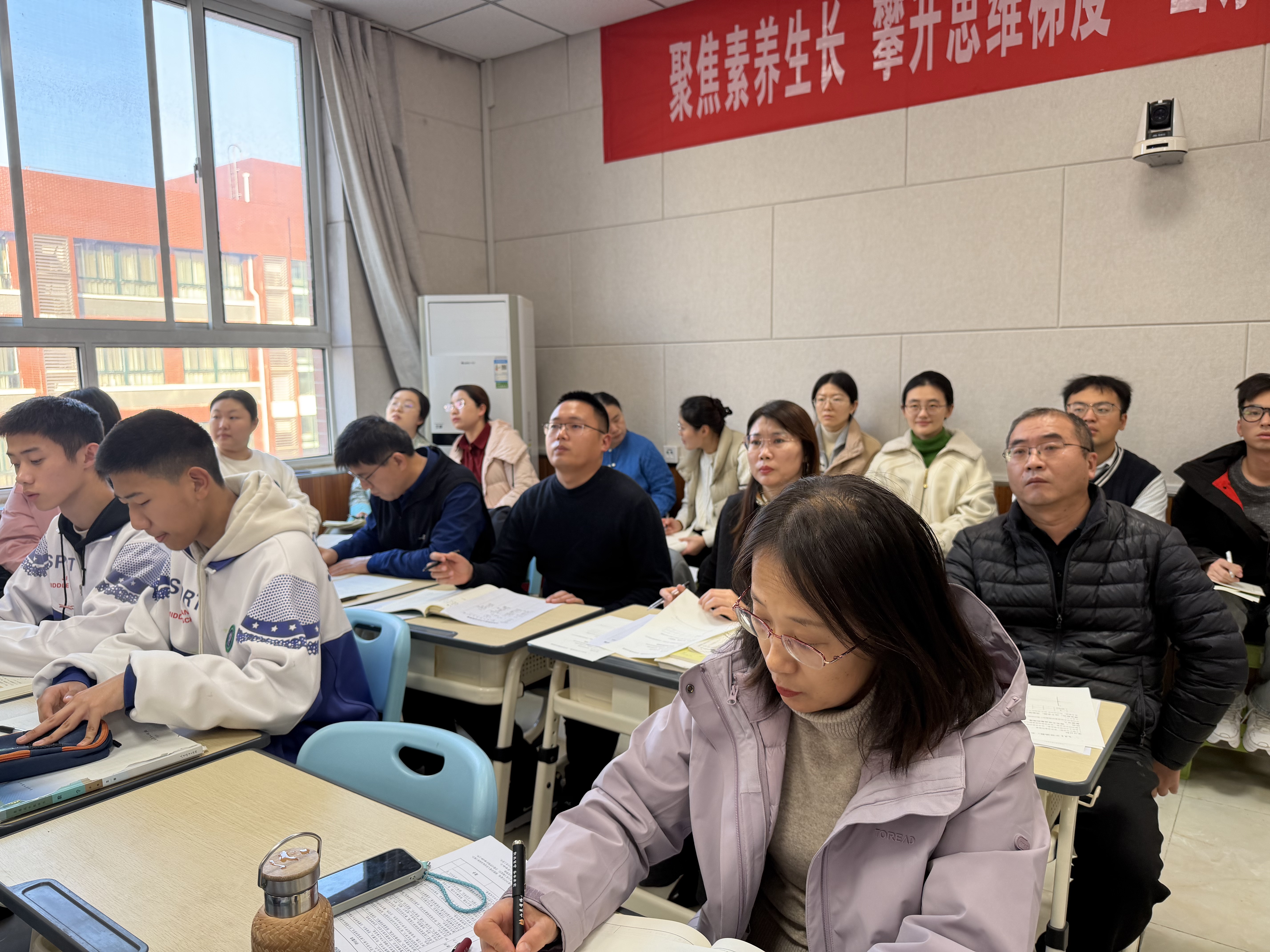 当数学函数遇见单位圆,当地理课堂追寻苏轼足迹,当社会保障对话AI“盲盒”,当黄土高原的土壤来到身边……近日,济南中学一场别开生面的“新课堂”展示活动,展现了教学创新的无限可能。七位青年教师立足各自学科,以扎实的专业功底、巧妙的教学设计和活跃的课堂组织能力,充分彰显了各教研组深耕教研、聚力赋能的集体智慧与我校教师队伍的蓬勃生机,共同绘就了一幅“以学生为中心”的活力教学新图景。唐冶校区各学科教师齐聚一堂,共同品课。