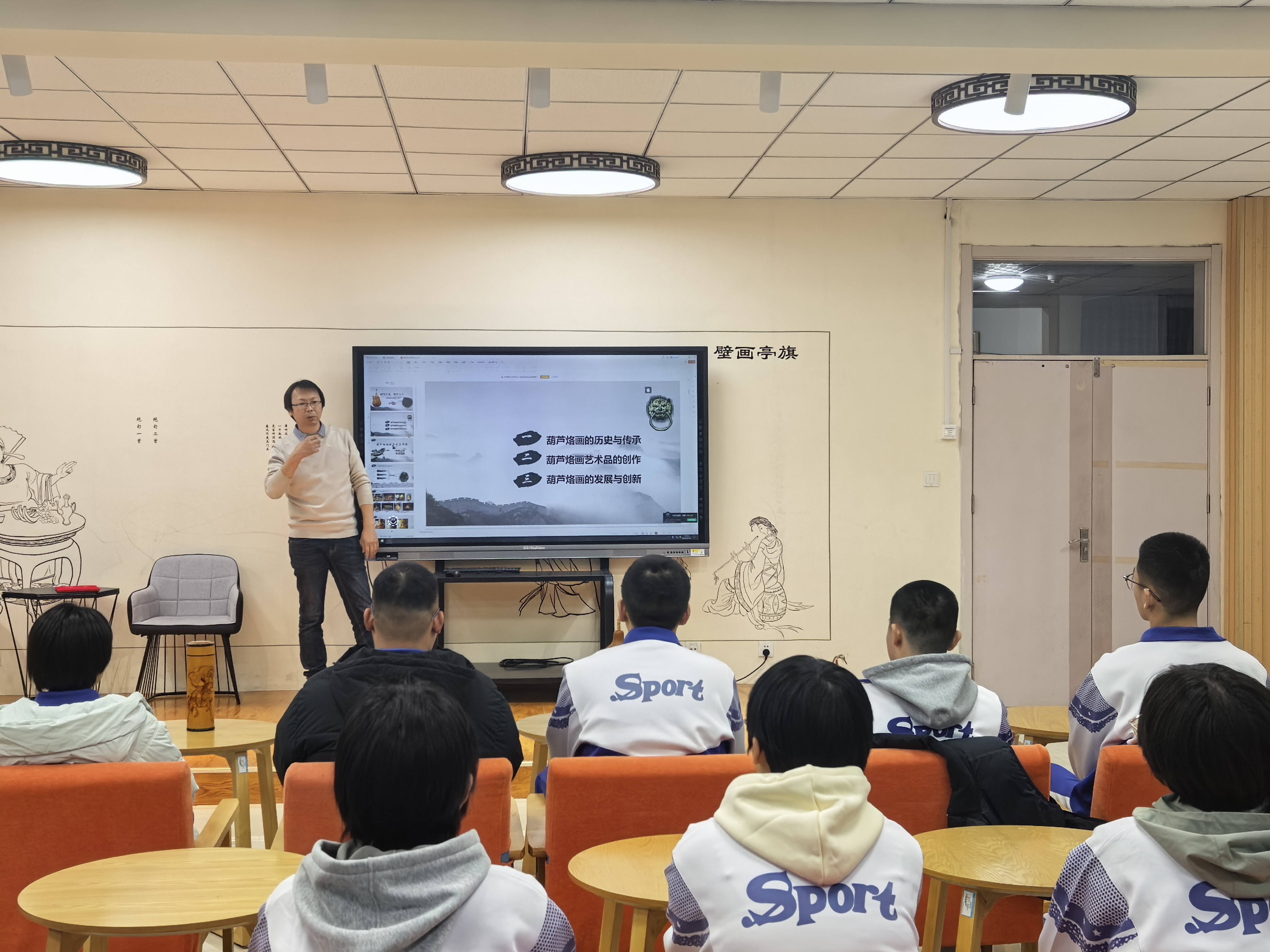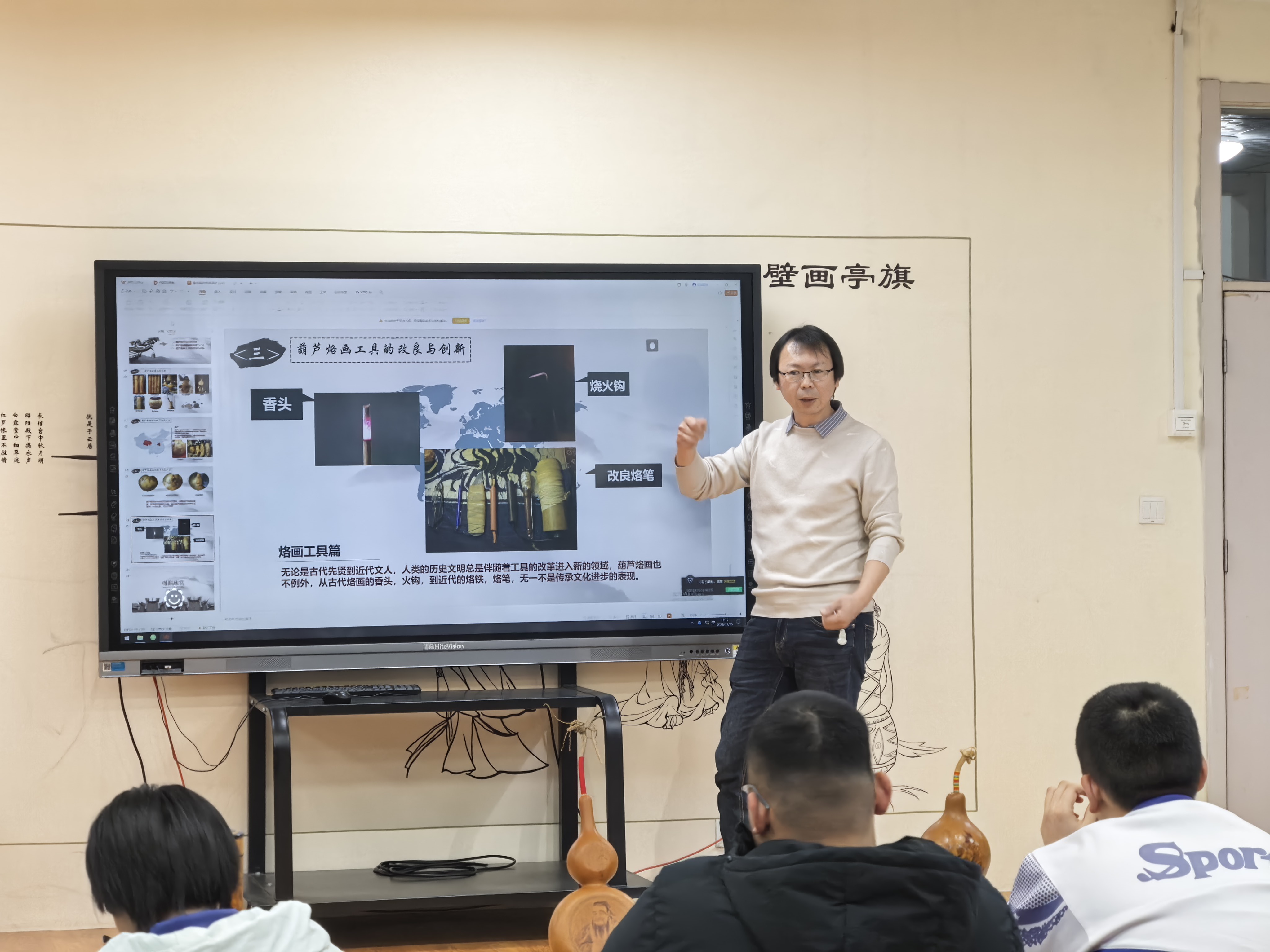 作为深耕葫芦烙画三十载的业界名家,李亚宁先生不仅斩获泰山文艺奖等多项荣誉,更怀揣着对孩子成长的关爱与文化传承的初心,以家长身份走进课堂。从浙江余姚河姆渡遗址发现的7000年葫芦遗存讲起,生动拆解烙画创作的核心,用通俗语言搭配鲜活案例,让同学们快速沉浸于传统技艺的精妙世界。